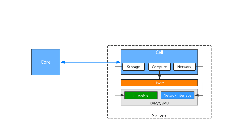 The Cell module runs on every server needs hosting instances. The Cell module base on KVM and Libvirt, it keeps collecting the resource status and synchronizes to the Core module in real-time. It allocates resources and assembles into a new instance for users when received a creating request.