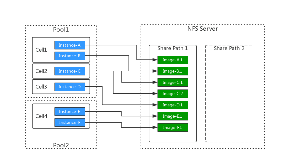 The storage pool encapsulates dedicated storage devices, such as NFS servers or FC SAN, as logical storage space. When creating an instance, the Core module allocates virtual volumes from the storage pool, then mount as a storage device.
