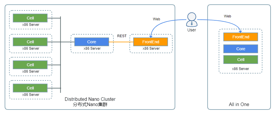 Nano builds one or more x86 servers into a virtual resource pool. When a user issues a creating request, the Core module selects the appropriate host according to the system load of each node in the target pool, then send message to build a new instance, and schedule the subsequent management and recycle.